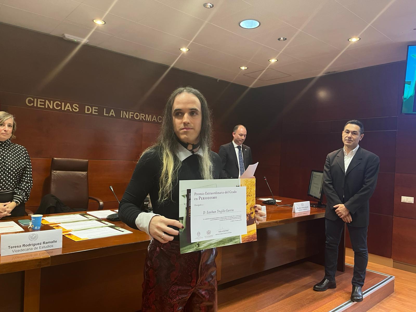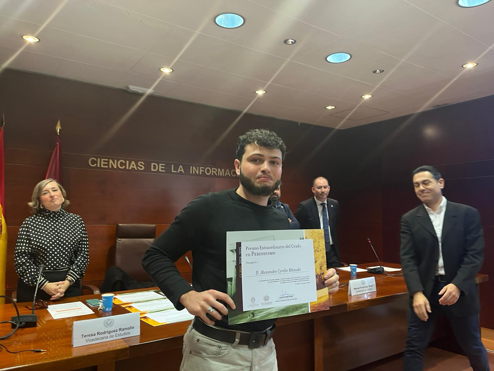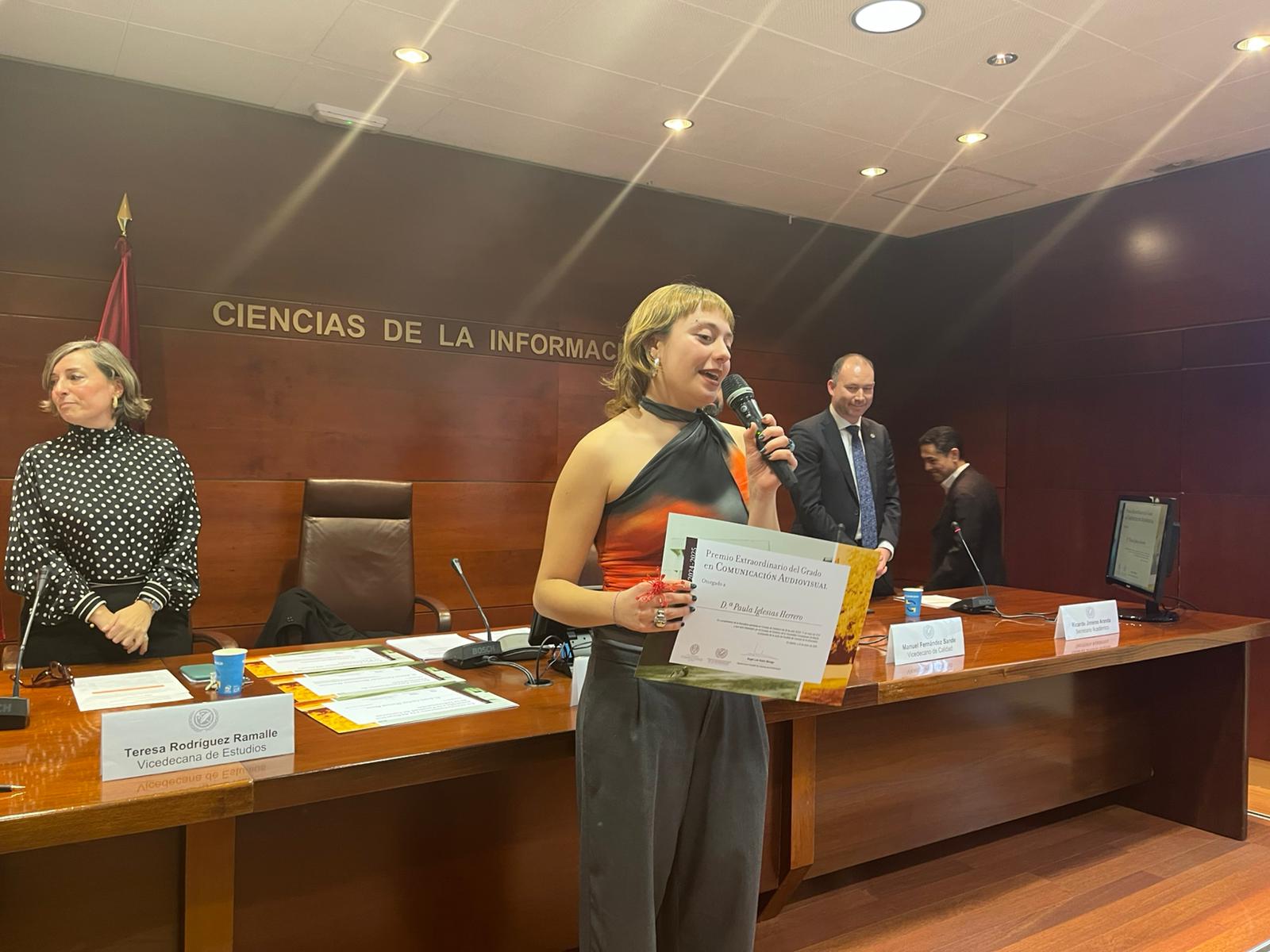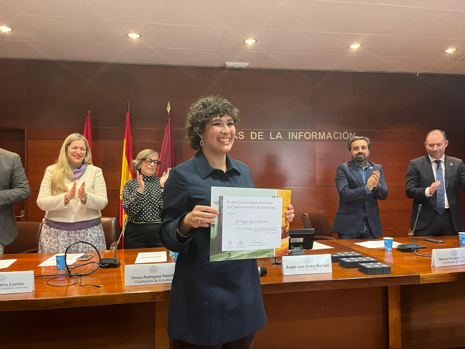 Con el aforo completo de premiados, homenajeados, familiares y compañeros, el acto organizado por el Gabinete de Comunicación de la Facultad, arrancó con las palabras de bienvenida del Decano, quien pidió guardar un minuto de silencio por las víctimas de la tragedia de Adamuz entre las que se encontraban dos egresados de nuestra Facultad. A continuación, el Vicedecano de Calidad y Política Académica, Manuel Fernández Sande, destacó la importancia de la calidad y la excelencia en la formación universitaria, dando paso a la Vicedecana de Estudios y Profesorado, Teresa Rodríguez Ramalle, que subrayó el compromiso de la Facultad con una docencia innovadora y adaptada a los retos del sector de la comunicación así como el carácter público de nuestro Centro.